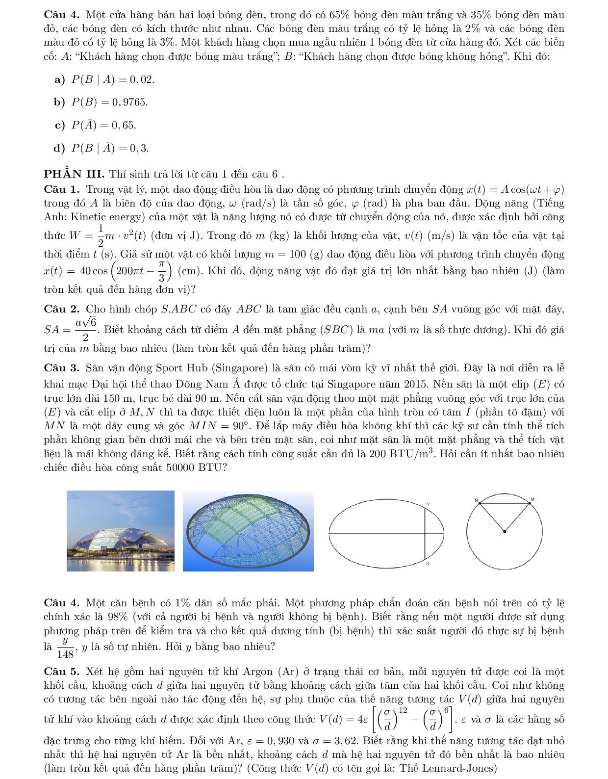 Phần III gồm 6 câu dạng trả lời ngắn. Tổng điểm tối đa toàn bài thi trắc nghiệm là 10.