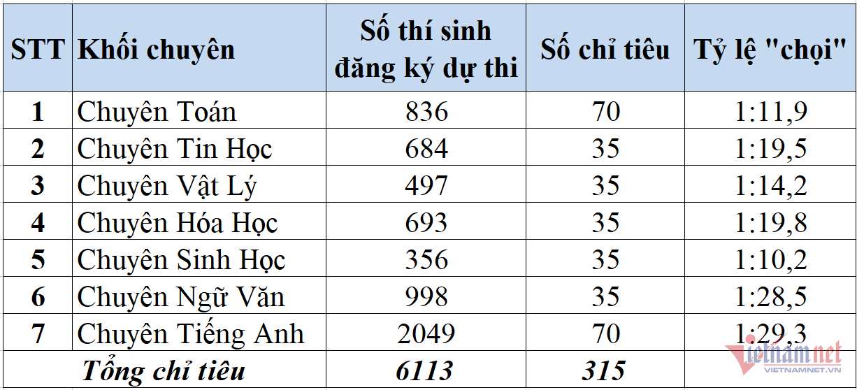 Năm 2023, các thí sinh cạnh tranh cho 315 suất vào các lớp chuyên của Trường THPT Chuyên ĐH Sư phạm Hà Nội (gồm các lớp Toán, Tin học, Vật lý, Hóa học, Sinh học, Ngữ văn và Tiếng Anh). Chỉ tiêu của khối chuyên Toán là 70, khối chuyên Tiếng Anh là 70, các khối chuyên còn lại là 35. Năm nay, nhà trường tăng 10 chỉ tiêu và chỉ thay đổi ở khối chuyên Tiếng Anh.