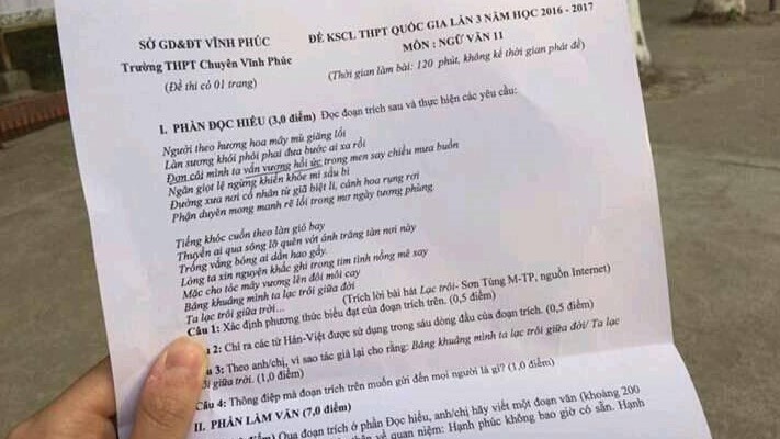Nhiều người khá bất ngờ khi đề thi khảo sát chất lượng môn Ngữ văn lớp 11 của một trường chuyên lấy tư liệu là bài hát “Lạc trôi” của Sơn Tùng M-TP và yêu cầu phân tích.