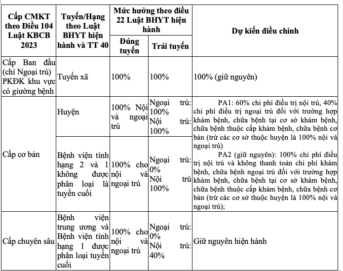 Luật Khám bệnh, chữa bệnh (sửa đổi, có hiệu lực từ 1/1/2024) quy định chuyển đổi 4 tuyến chuyên môn kỹ thuật (cấp xã, huyện, tỉnh, trung ương) thành 3 cấp (ban đầu, cơ bản, chuyên sâu). Vì thế, Bộ Y tế cho rằng cần sửa đổi, điều chỉnh các nội dung liên quan tới tuyến chuyên môn kỹ thuật, hạng bệnh viện trong Luật BHYT để đồng bộ với Luật Khám bệnh, chữa bệnh (sửa đổi), nhằm bảo đảm quản lý BHYT và thanh toán chi phí khám chữa bệnh phù hợp.