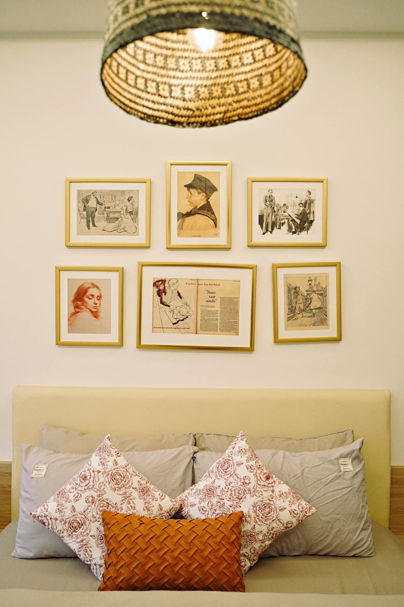Những bức tranh độc đáo, cá tính kết hợp với gối tựa họa tiết mang hơi hướng vintage.