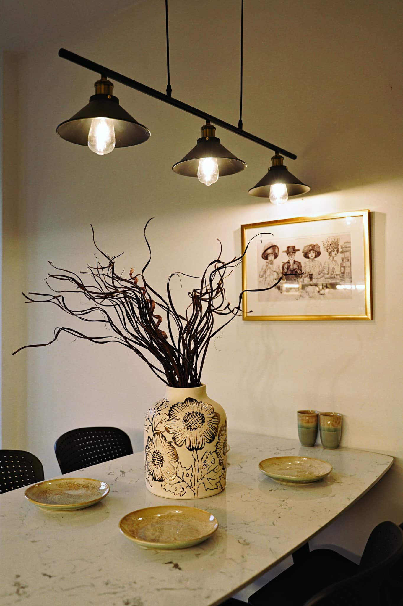 Tủ bếp được sơn lại, góc bàn ăn Phương Anh dùng đèn treo kiểu cổ điển. Không gian khác rất nhiều so với ban đầu. "Bất cự sự thay đổi nào, dù là nhỏ cũng sẽ làm căn hộ đổi khác. Với cách bố trí này, tôi không làm kết cấu căn hộ bị biến đổi mà giúp không gian sống thêm cá tính và có hồn", Phương Anh nói.