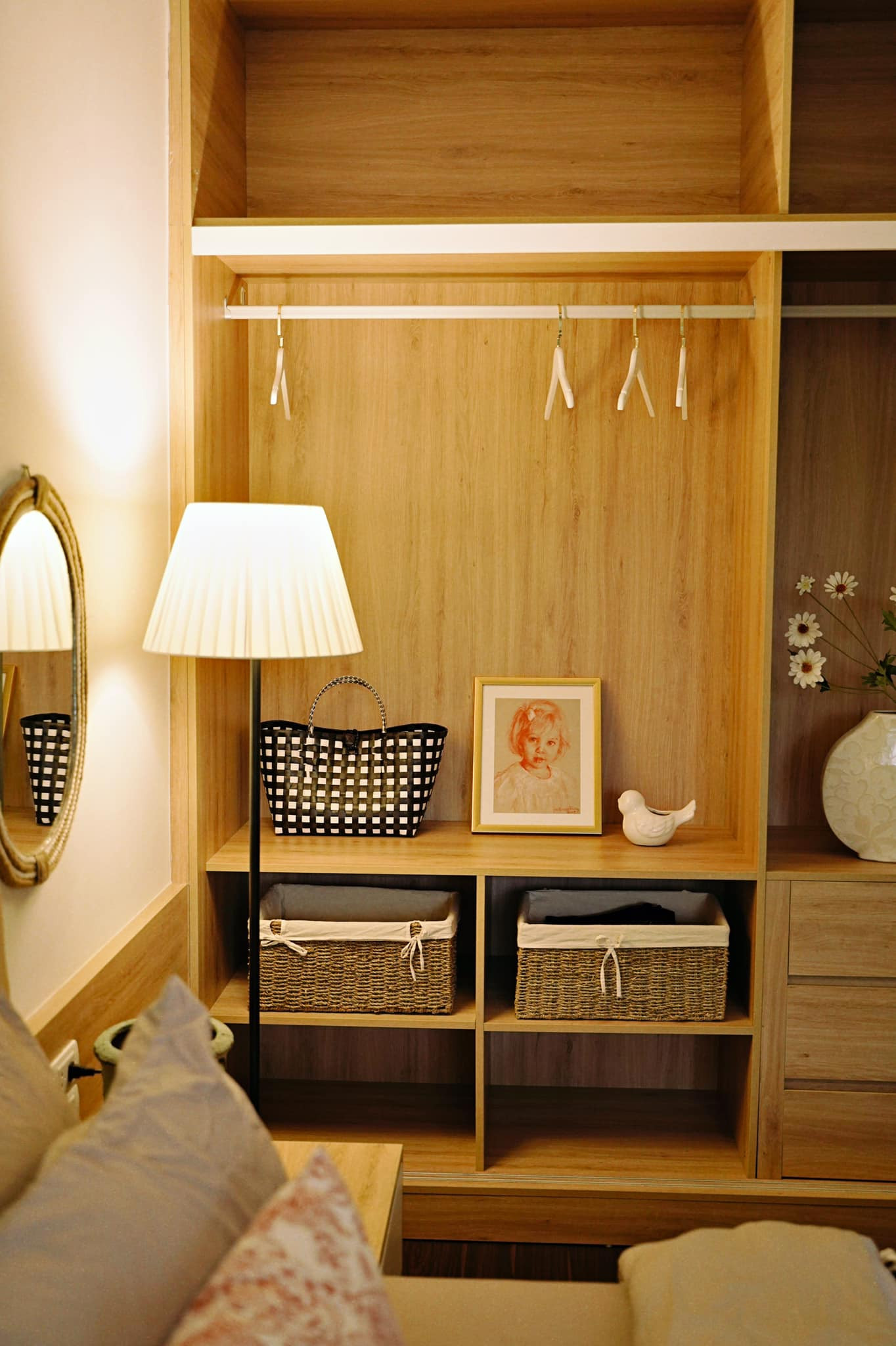 Đèn ngủ cây chiếu sáng vào buổi tối rất ấm áp, lãng mạn mà không bị quá chói. Tủ đựng quần áo được tháo cánh và thiết kế thành các khoang đựng đồ mở và kệ bày trí. Mỗi khoang có 1 giỏ đan mây cất các vật dụng nhỏ.