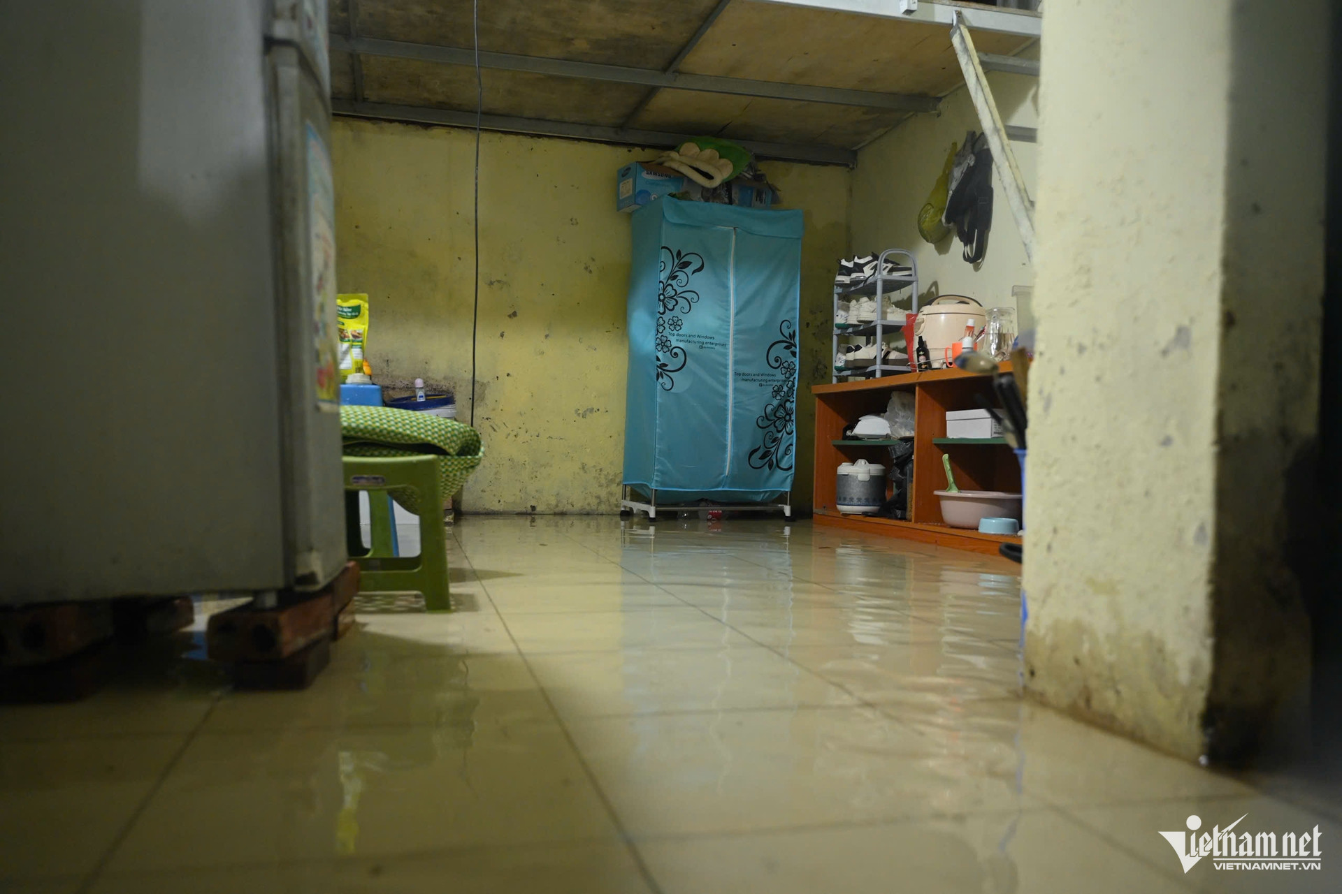Nước trào qua cống nhà vệ sinh của phòng trọ nên Miện và bạn cũng gặp khó khăn trong việc vệ sinh cá nhân và nấu nướng.