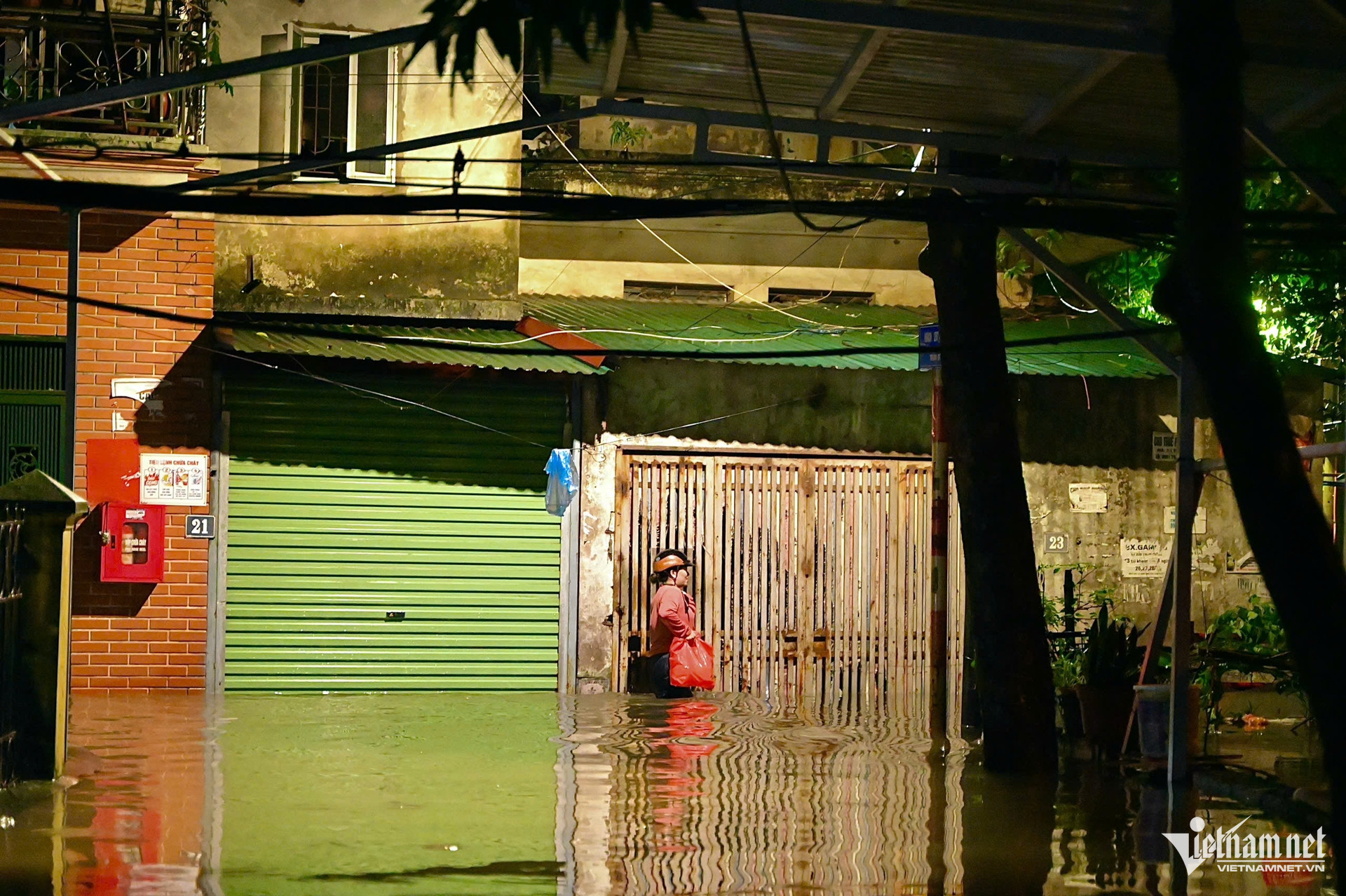 Nhiều hộ gia đình đóng cửa từ sớm để ngăn nước tràn vào nhà, đồng thời chủ động ngắt điện để đảm bảo an toàn. Bởi vậy mà nhiều đoạn ngõ tối om. Những gia đình còn mở cửa, sáng đèn chủ yếu là các hàng quán, đang tất bật dọn dẹp đồ đạc.