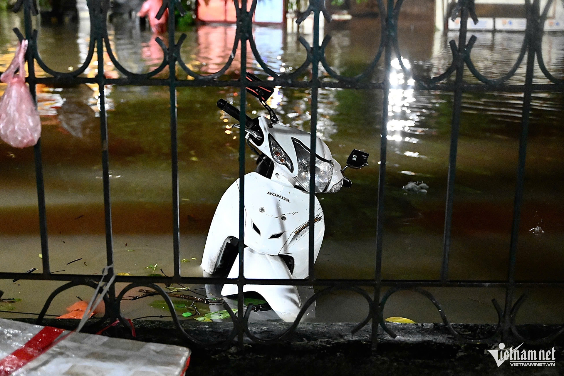Tối 30/9, ngõ 297 phố Trần Cung (trước đây thuộc phường Cổ Nhuế 1, quận Bắc Từ Liêm, Hà Nội) ngập sâu trong "biển nước". Khu vực đầu ngõ vốn đông đúc người qua lại, hàng quán sầm uất bỗng trở nên "yên tĩnh và tối lạ thường".