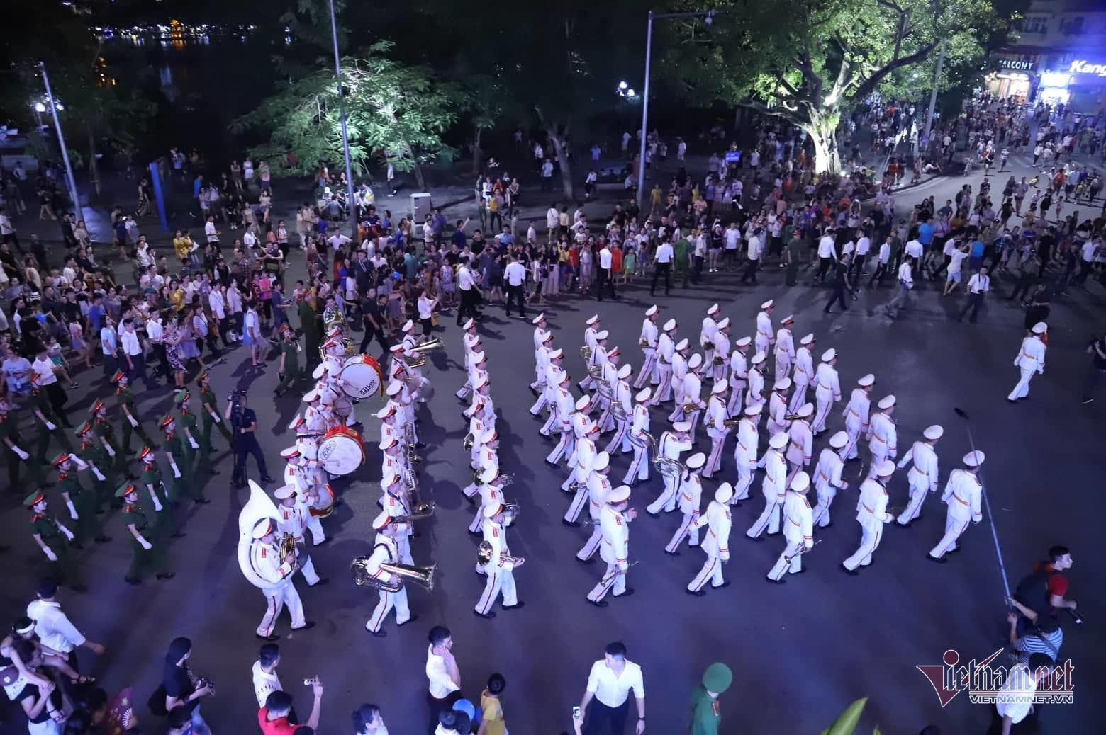 Phố đi bộ hồ Gươm hôm nay thật khác lạ. Từ 19h15 - 21h15, các nhạc công của đội nhạc lễ, nghi lễ Công an nhân dân thuộc Bộ Tư lệnh Cảnh sát cơ động, Bộ Công an biểu diễn, diễu hành phục vụ người dân Thủ đô và du khách thập phương.