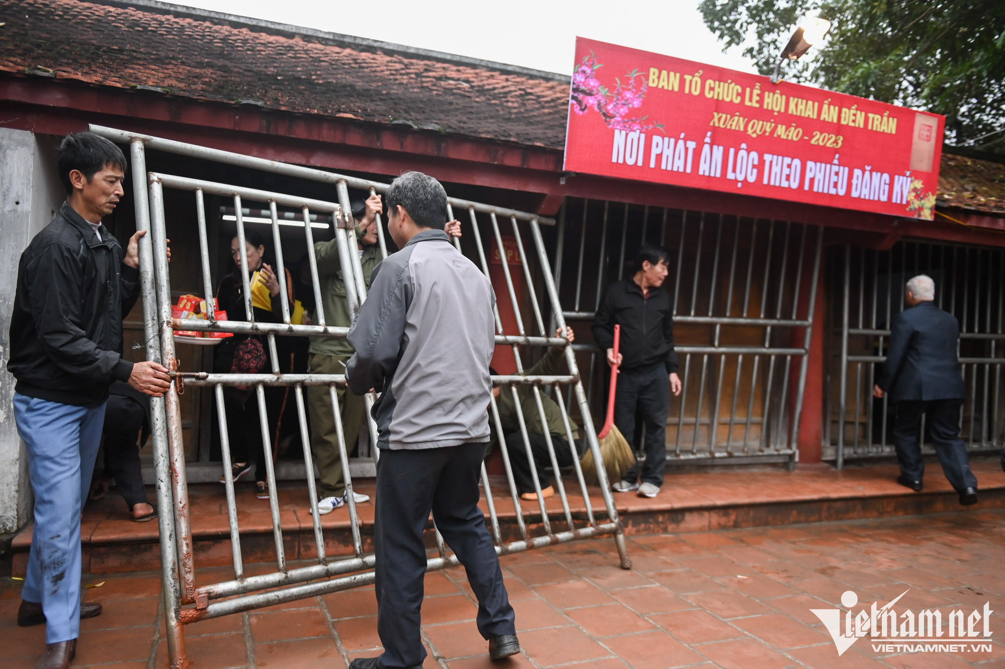 15h, tại nhà Giải Vũ, lực lượng bảo vệ kéo hàng rào sắt, chuẩn bị cho thủ tục phát ấn diễn ra từ 5h sáng 5/2 (15 tháng Giêng).