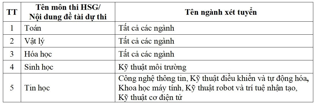 - Xét tuyển thẳng học sinh đoạt giải quốc gia, quốc tế. Theo đó, thí sinh đoạt giải nhất, nhì, ba trong kỳ thi chọn học sinh giỏi quốc gia, quốc tế hoặc thi khoa học, kỹ thuật cấp quốc gia, quốc tế do Bộ GD-ĐT tổ chức, cử tham gia; thời gian đoạt giải không quá 3 năm tính tới thời điểm xét tuyển thẳng đã tốt nghiệp THPT được xét tuyển thẳng vào trường theo ngành phù hợp với môn thi. Cụ thể như sau: