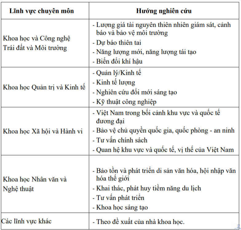Cụ thể, đối tượng thu hút là các nhà khoa học có thành tích nghiên cứu xuất sắc, ở trong và ngoài nước (bao gồm cả người Việt Nam ở nước ngoài và người nước ngoài), có mong muốn tham gia nghiên cứu khoa học, đảm nhận các vị trí Trưởng nhóm nghiên cứu mạnh ở các lĩnh vực khoa học và công nghệ mà ĐH Quốc gia Hà Nội định hướng nghiên cứu ưu tiên.