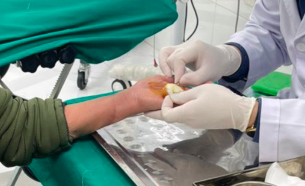 Vết thương mặt trước cổ tay bị đứt lìa có kích thước 6x2 cm, đứt toàn bộ động mạch trụ, động mạch quay, thần kinh giữa, thần kinh trụ, đứt toàn bộ gân gấp nông sau các ngón từ 1 đến 5.