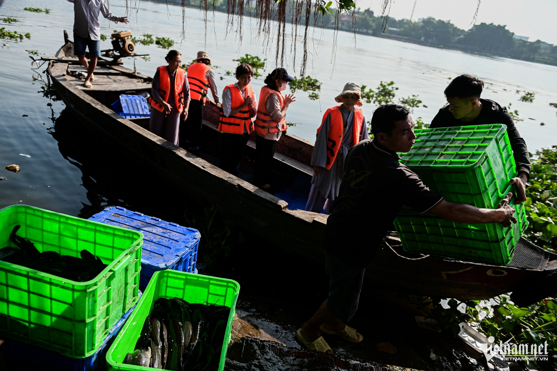 Nhiều người dân thuê thuyền ra giữa sông để phóng sinh thay vì thả cá ở ven bờ, sợ cá bị mắc kẹt.