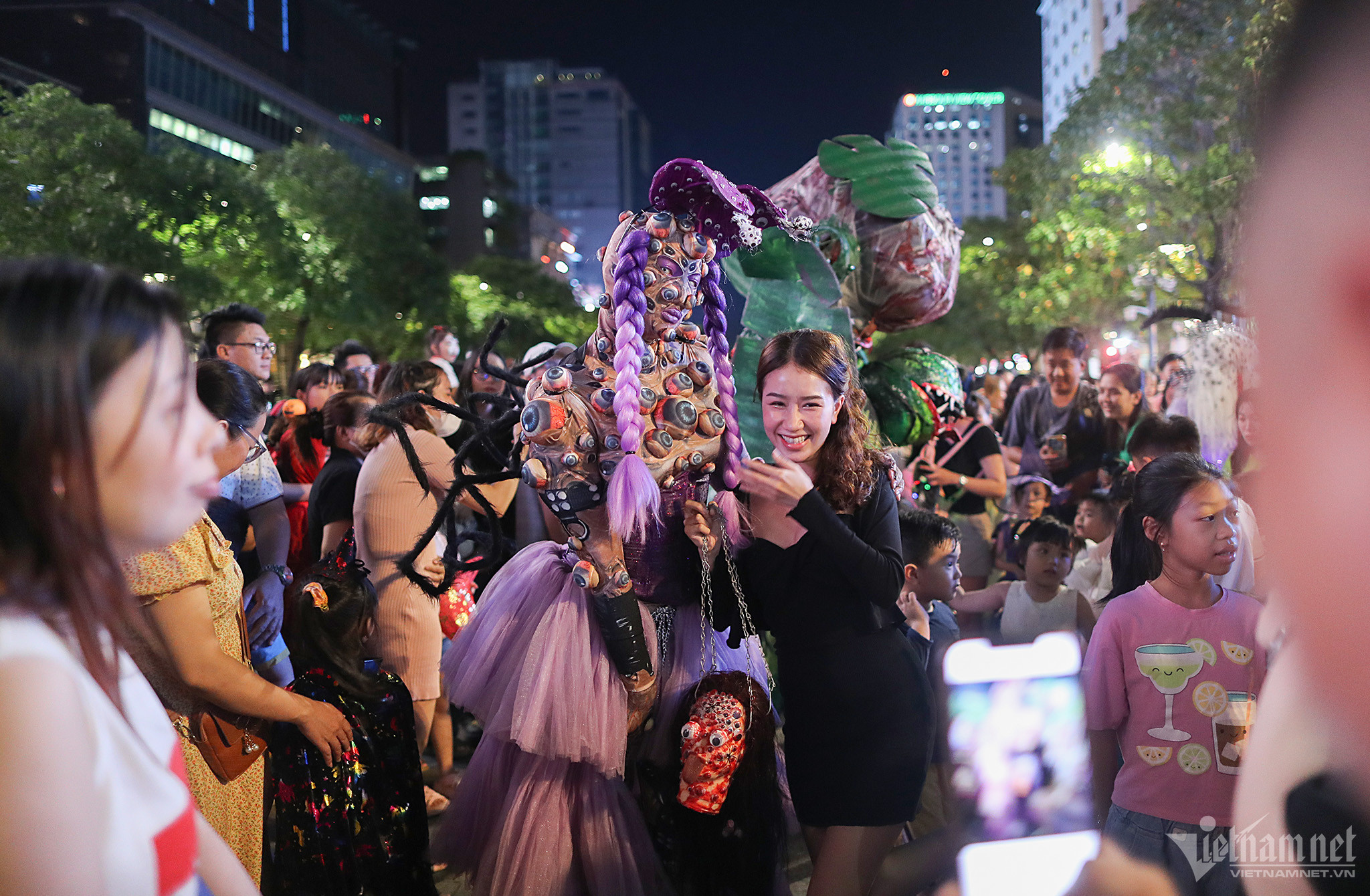 Nhóm của Quỳnh Anh trở thành tâm điểm tại phố đi bộ Nguyễn Huệ đêm Halloween. Mọi hành động đều được du khách hò reo hưởng ứng, dòng người vây kín lối đi.