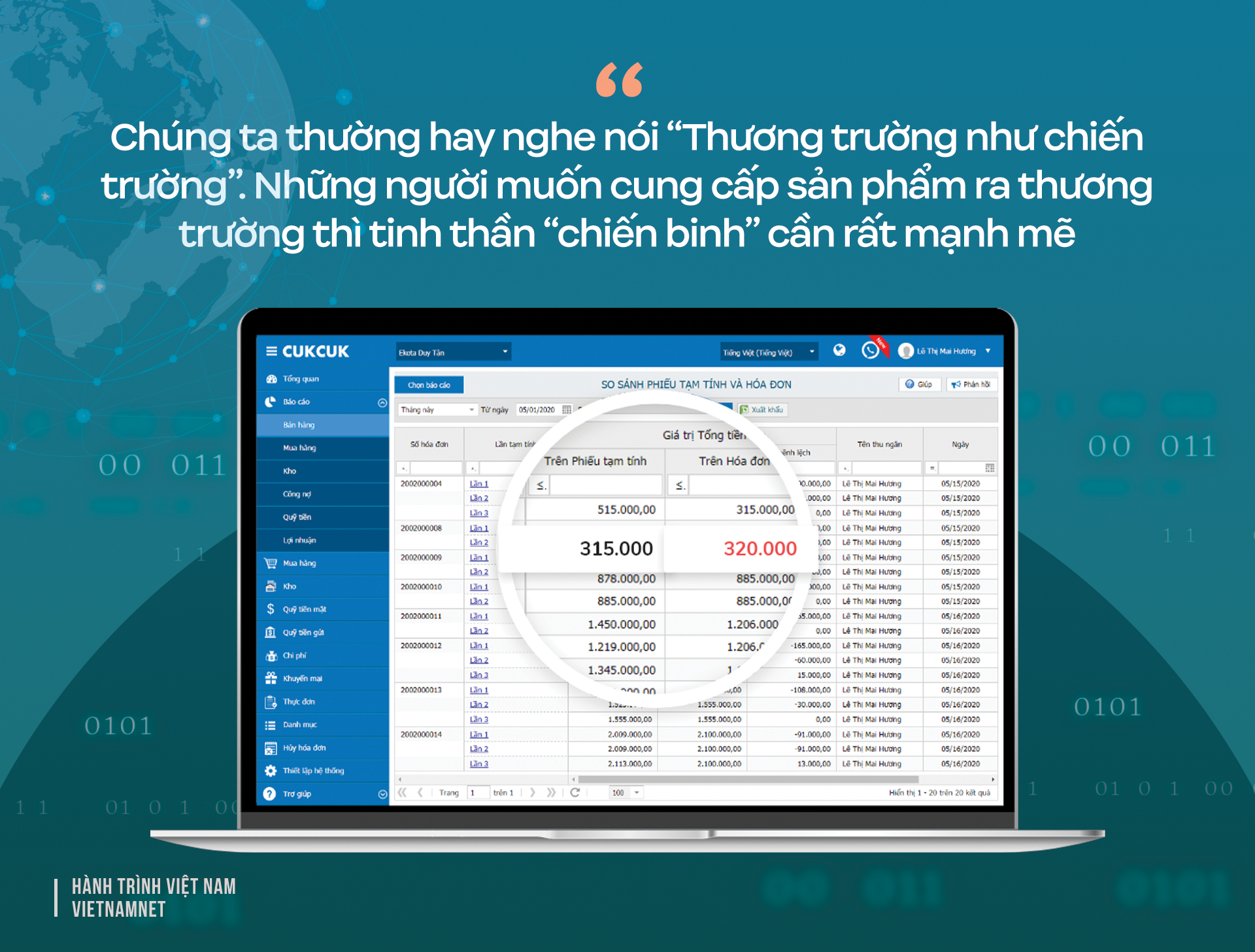Còn về khát vọng bước chân ra thế giới, với thành công bước đầu của CukCuk, chúng tôi kỳ vọng sắp tới sản phẩm này sẽ đem lại doanh số 50 triệu USD. Doanh số cũng chỉ là một phần nhỏ thôi. Quan trọng là tương đương với doanh số đấy sẽ là sự gia tăng số lượng khách hàng sử dụng trên thị trường quốc tế. Điều đó đồng nghĩa sản phẩm, dịch vụ của MISA, của Việt Nam, dưới tư cách sản phẩm thương mại, đã bắt đầu có tên trên bản đồ công nghệ thông tin của thế giới. Qua đó khẳng định rằng người Việt Nam hoàn toàn có thể làm được những sản phẩm phần mềm tốt để cung cấp rộng rãi cho thị trường quốc tế.