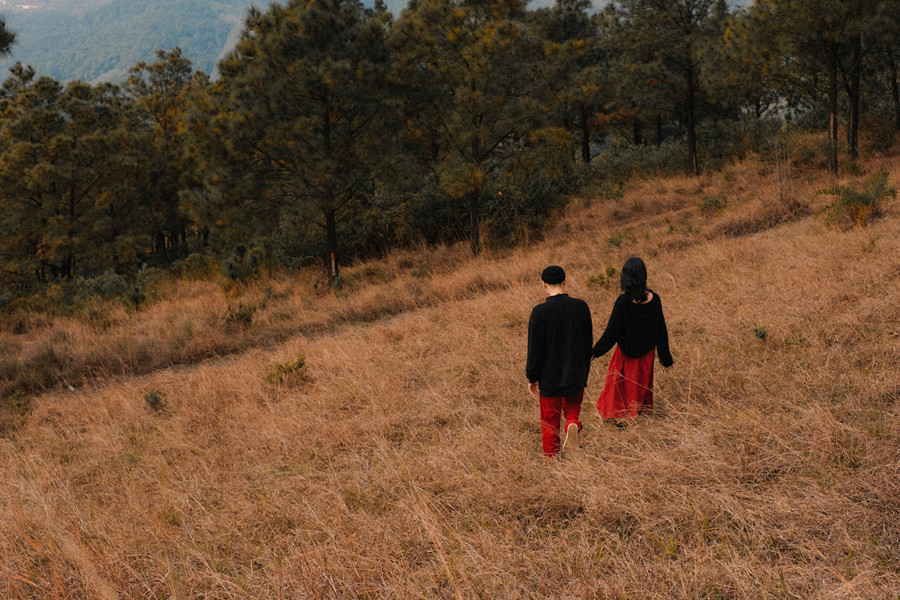 Đôi bạn trẻ chọn trang phục tông màu đen, đỏ để trở nên nổi bật giữa khung cảnh cánh đồng cỏ cháy đẹp như tranh, xa xa lấp ló những cây thông lùn màu xanh mướt.