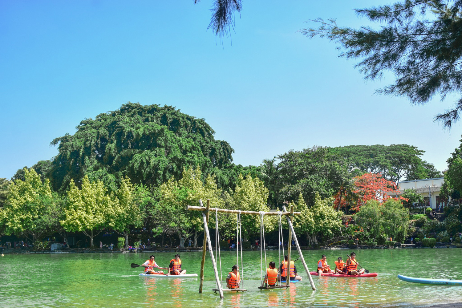 Đến đây, du khách không khỏi ấn tượng với thiết kế thác nước cao cùng cây xanh tự nhiên, không gian mát mẻ mà còn có cơ hội tham gia nhiều hoạt động ngoài trời thú vị như chèo SUP, chơi mô tô nước - đạp vịt, trải nghiệm nhà phao liên hoàn, massage cá,…
