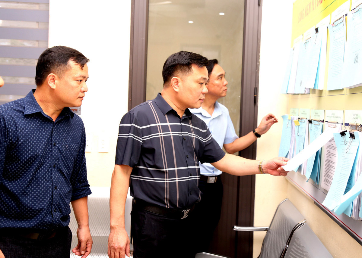 | Chủ tịch UBND huyện Xín Mần Nguyễn Tiến Hùng kiểm tra việc niêm yết thủ tục hành chính tại bộ phận tiếp nhận và trả kết quả của huyện. |