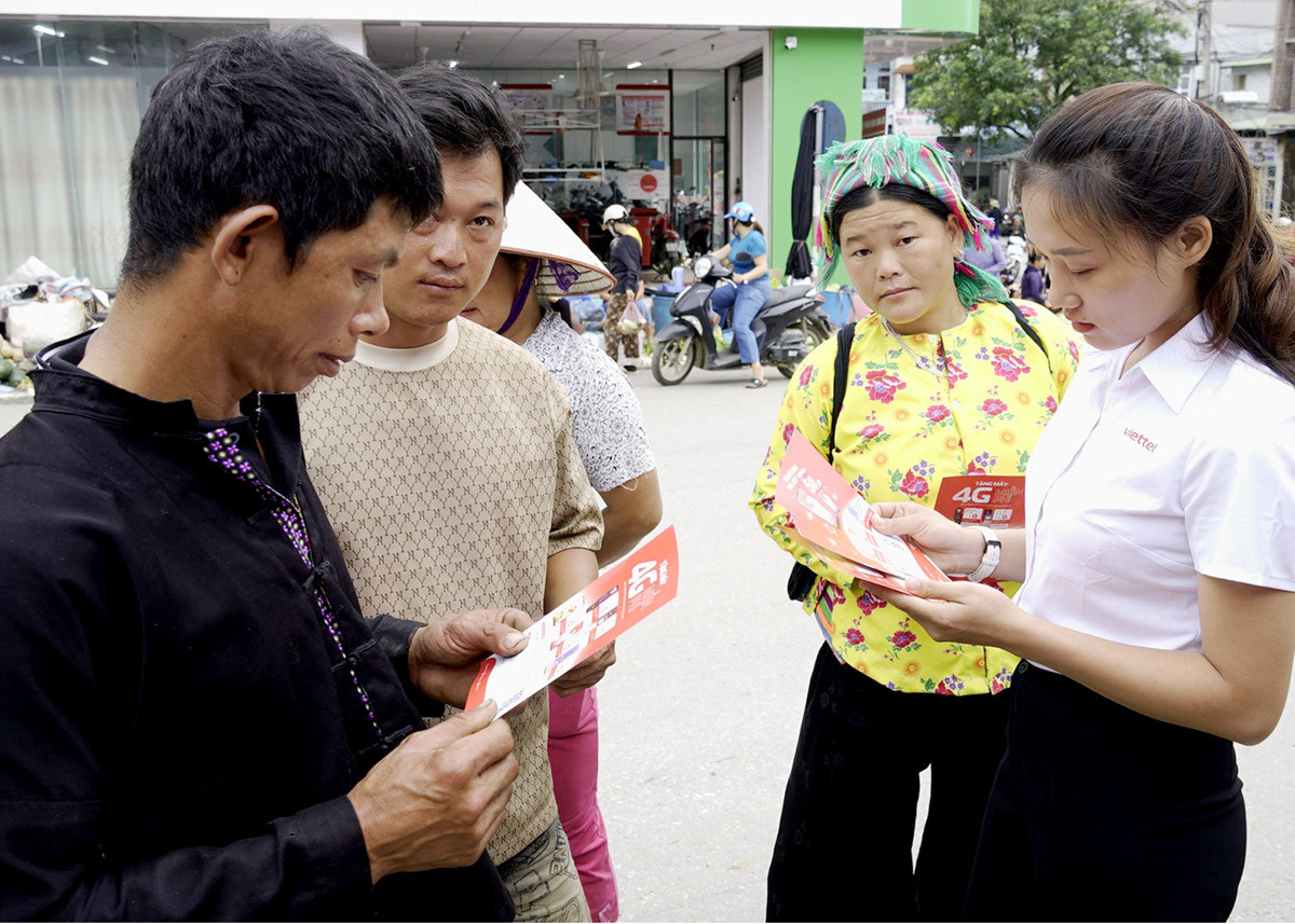| Nhân viên Viettel chi nhánh huyện Xín Mần tư vấn, hỗ trợ người dân thay đổi thiết bị 2G sang thiết bị 4G. |