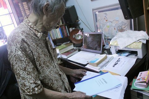 Dịch giả Dương Tường bên tủ sách trong phòng làm việc của ông |