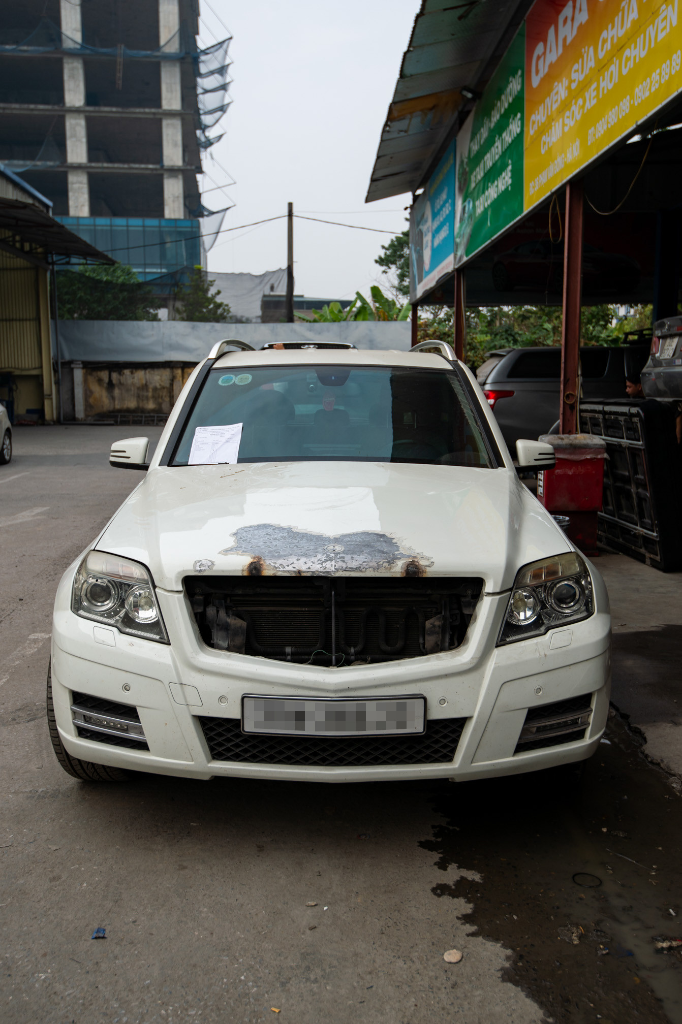Đa số chủ xe mang "xế cưng" đến gara thời điểm này để bảo dưỡng động cơ, hệ thống phanh, đánh các vết xước sơn hoặc thay thế phụ tùng. Trong ảnh, chiếc Mercedes GLK 300 được sơn lại nắp capo, phục hồi cản trước.