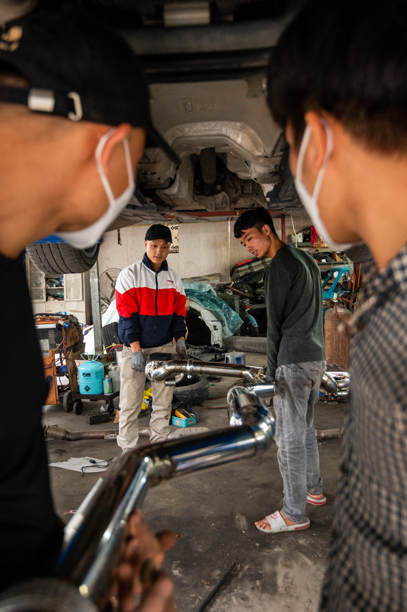 Bên cạnh các yêu cầu về sửa chữa bảo dưỡng, thị trường đồ chơi ôtô dịp Tết cũng nhộn nhịp hơn ngày thường như thiết bị âm thanh, camera hành trình, độ ghế da,... Trong ảnh, một chủ xe Mercedes C300 chịu chơi chi hơn 40 triệu đồng để độ lại ống xả.