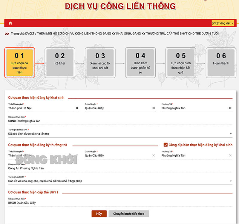 Tất cả thông tin đã được so sánh, đối soát trên Cơ sở dữ liệu quốc gia về dân cư. Quy trình thực hiện DVC liên thông này trên Cổng DVC sẽ được thực hiện qua 6 bước, gồm: (1) Lựa chọn cơ quan thực hiện, (2) Kê khai, (3) Xem lại các tờ khai chi tiết, (4) Đính kèm thành phần hồ sơ, (5) Lựa chọn hình thức nhận kết quả, (6) Hoàn thành.