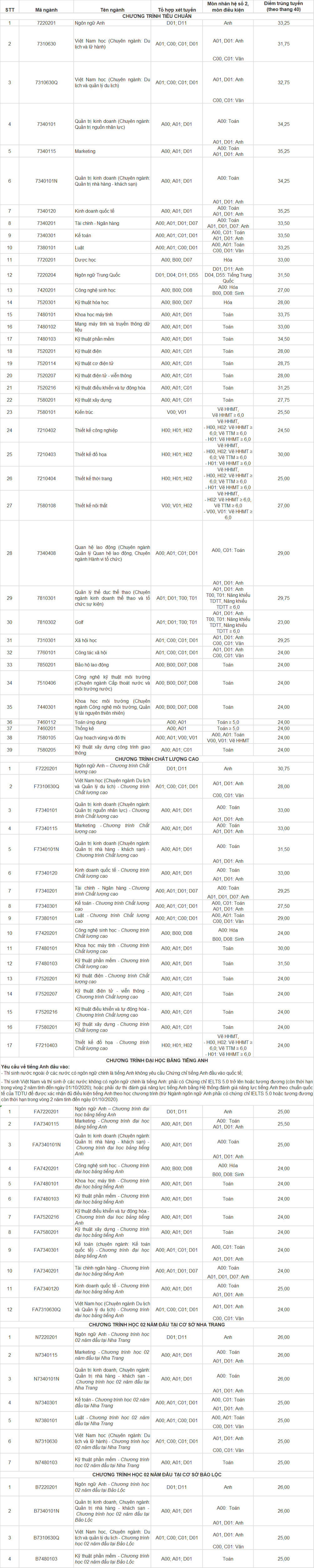 - Cùng chương trình tiêu chuẩn nhưng học 2 năm đầu ở Cơ sở Nha Trang/ Bảo Lộc, điểm trúng tuyển cho các ngành ở mức 25,00 và 26,00 điểm.