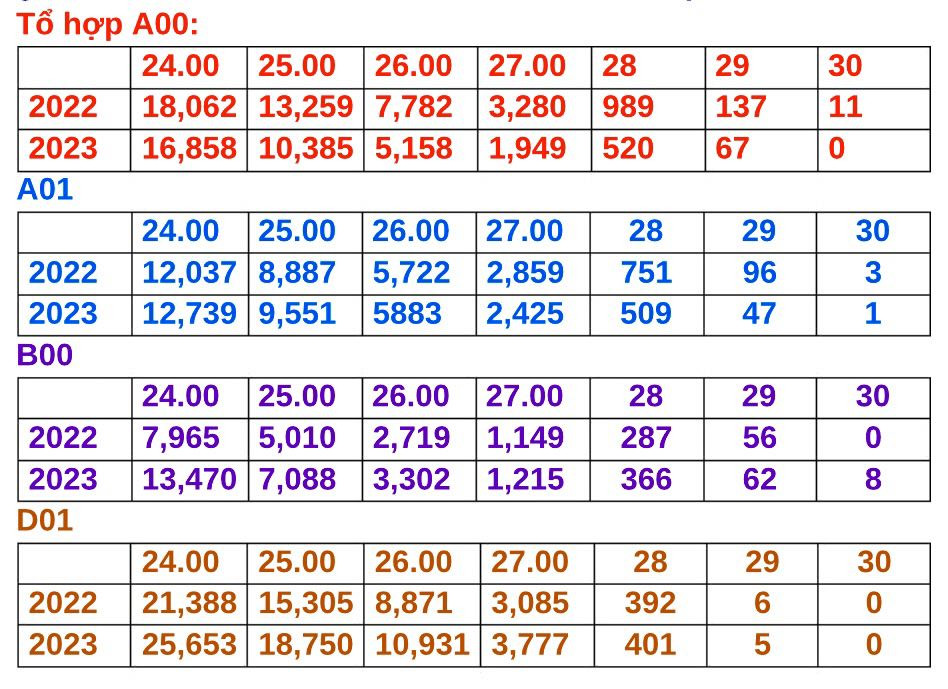 Tổ hợp B00, số thí sinh điểm từ 24 điểm đến 30 điểm tăng hơn 8,5 nghìn. Tổ hợp C00, số thí sinh điểm từ 24 điểm đến 30 điểm giảm gần 20 nghìn. Tổ hợp D01, số thí sinh điểm từ 24 điểm đến 30 điểm tăng hơn 15 nghìn. Cho nên, điểm sàn (trừ khối ngành Sư phạm, Y Dược) phần lớn ở nhiều trường sẽ vẫn ở mức 15 điểm (tương đương năm 2022).
