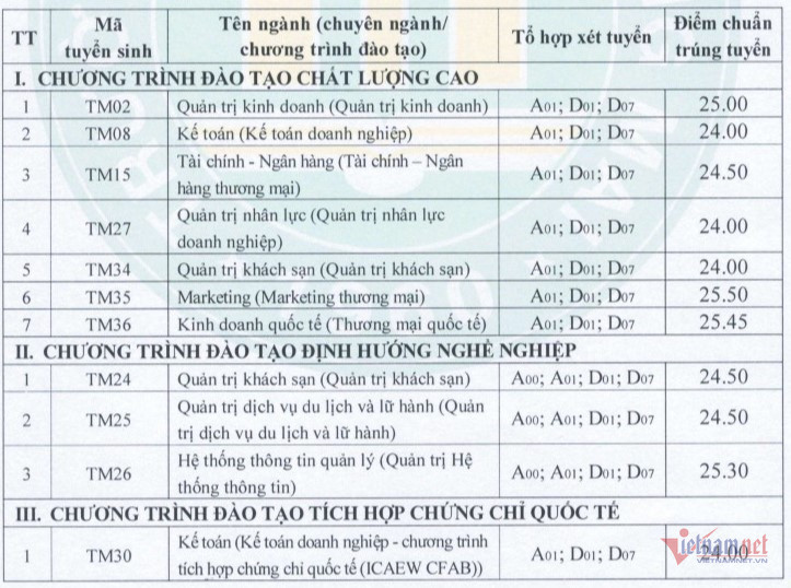 Cụ thể, điểm chuẩn trúng tuyển đại học chính quy năm 2023 các chương trình đào tạo chuẩn của Trường ĐH Thương mại xét tuyển theo kết quả thi tốt nghiệp THPT năm 2023 như sau: