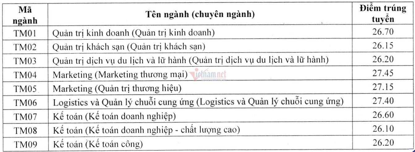 Chuyên ngành Marketing thương mại thuộc ngành Marketing có điểm chuẩn cao nhất lên đến 27,45 điểm. Hai ngành có mức điểm chuẩn thấp nhất là Quản trị khách sạn và Quản trị dịch vụ du lịch và lữ hành cũng lên đến 25,8 điểm.