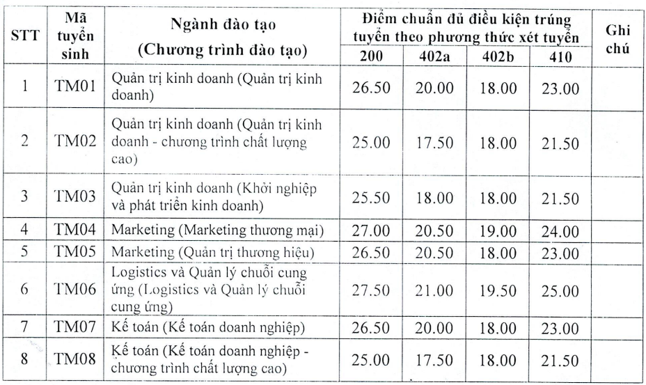 Trường ĐH Thương mại vừa công bố điểm chuẩn theo 4 phương thức xét tuyển gồm xét theo học bạ (mã phương thức xét tuyển 200), xét theo kết quả đánh giá năng lực (402a), xét theo điểm thi đánh giá tư duy (402b) và xét kết hợp chứng chỉ quốc tế và điểm học bạ (410).