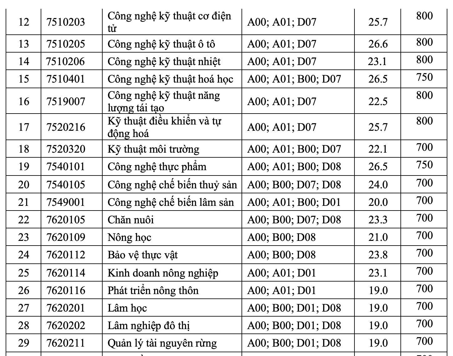 Theo đó, điểm chuẩn cao nhất ở phương thức xét học bạ là 27.7 điểm tất cả các tổ hợp môn xét tuyển của ngành Thú y. Điểm chuẩn cao nhất của phương thức xét tuyển theo kết quả thi đánh giá năng lực là 800 điểm ở các ngành thuộc nhóm Cơ khí công nghệ và Thú y, Ngôn ngữ Anh.