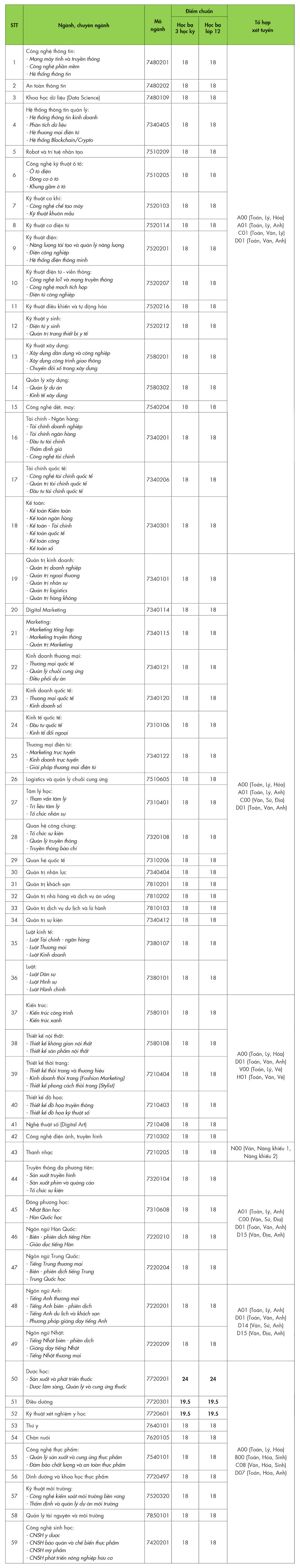 Cụ thể, ngành Dược học có mức điểm chuẩn cao nhất là 900 điểm. Các ngành khác có điểm chuẩn cao là Quản trị kinh doanh, Digital Marketing, Công nghệ thông tin, Công nghệ kỹ thuật ô tô với 800 điểm; Thiết kế đồ họa, Ngôn ngữ Anh, Truyền thông đa phương tiện, Quan hệ công chúng, Marketing, Logistics và quản lý chuỗi cung ứng, Thú y, Điều dưỡng, Kỹ thuật xét nghiệm y học với 750 điểm.