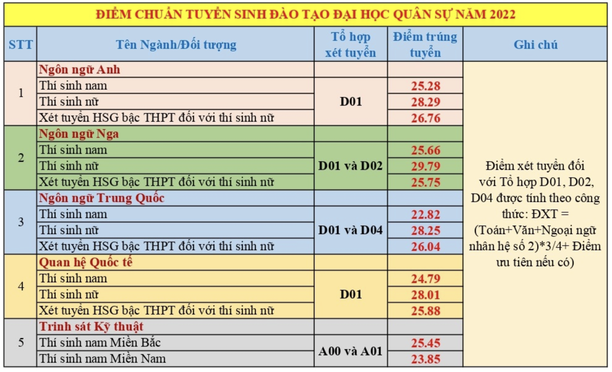 Điểm chuẩn dành cho thí sinh nữ cao hơn thí sinh nam. Trong đó điểm chuẩn cao nhất là 29,79 dành cho thí sinh nữ ngành Ngôn ngữ Nga, áp dụng cho khối D01 và D02.