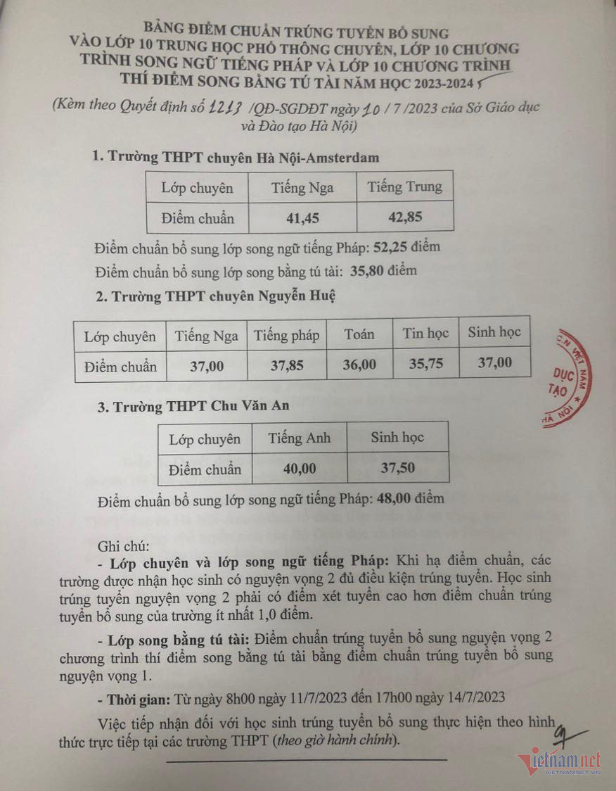Trước đó, ngày 1/7, Sở GD-ĐT Hà Nội công bố điểm chuẩn trúng tuyển đợt 1 vào lớp 10 các trường THPT công lập không chuyên và trường THPT chuyên năm học 2023-2024.