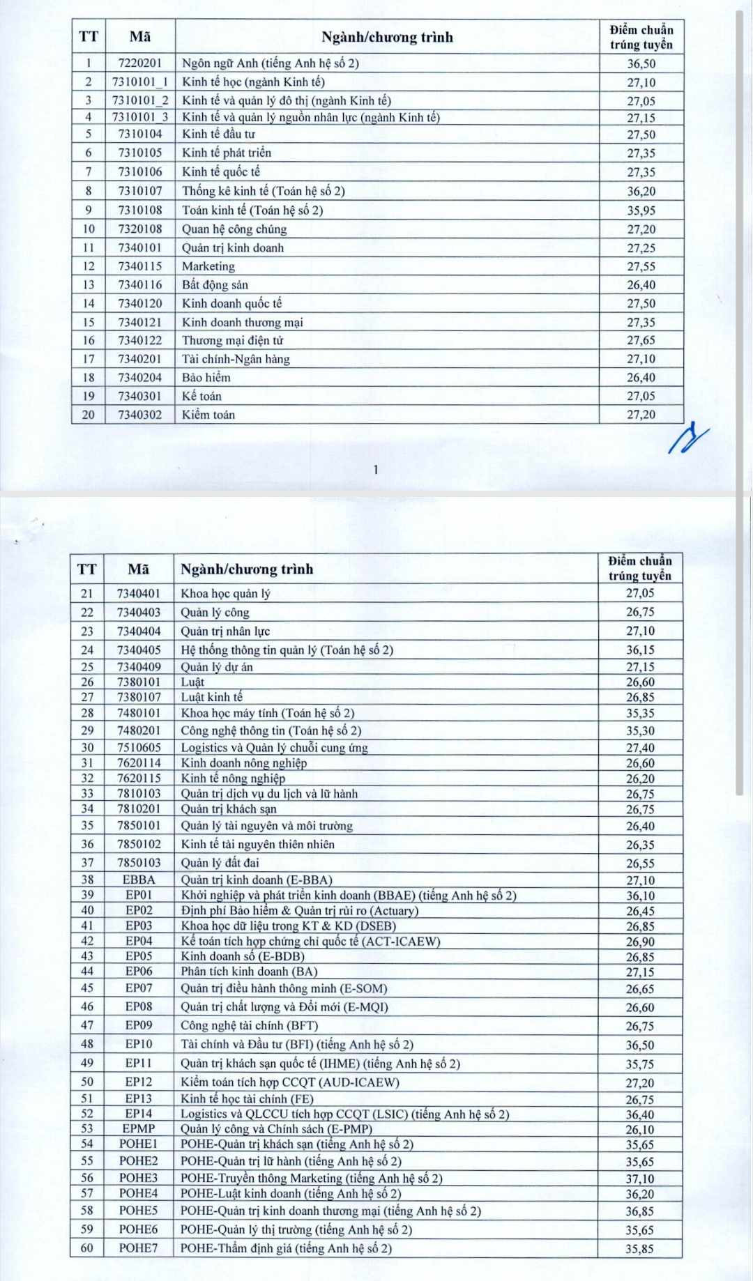Xét theo thang điểm 30, các ngành của trường năm 2023 đều lấy trên 26 điểm. Trong đó, ngành Thương mại điện tử có điểm chuẩn cao nhất với 27,65 điểm. Đối với các ngành xét theo thang điểm 40 (tiếng Anh hệ số 2) điểm chuẩn đều trên 35, trong đó ngành Truyền thông Marketing lấy cao nhất với 37,1 điểm.