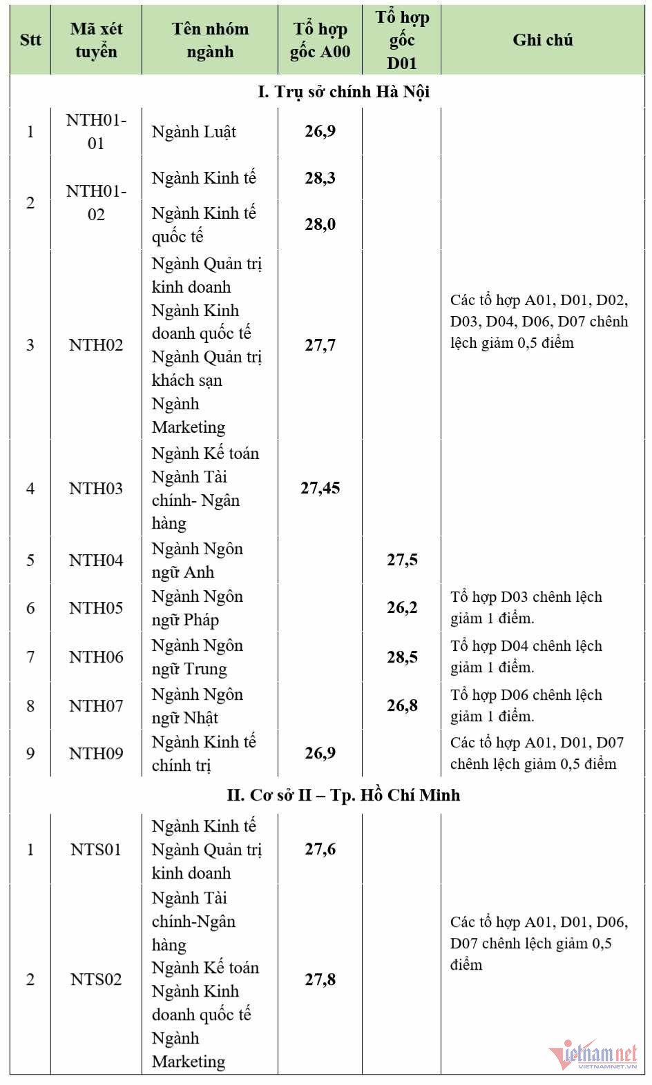Theo đó, điểm trúng tuyển các nhóm ngành của Trường ĐH Ngoại thương năm 2023 tương đối đồng đều và có mức điểm cao nhất là 28,5 của tổ hợp D01 đối với ngành Ngôn ngữ Trung Quốc - chuyên ngành Tiếng Trung Thương mại.