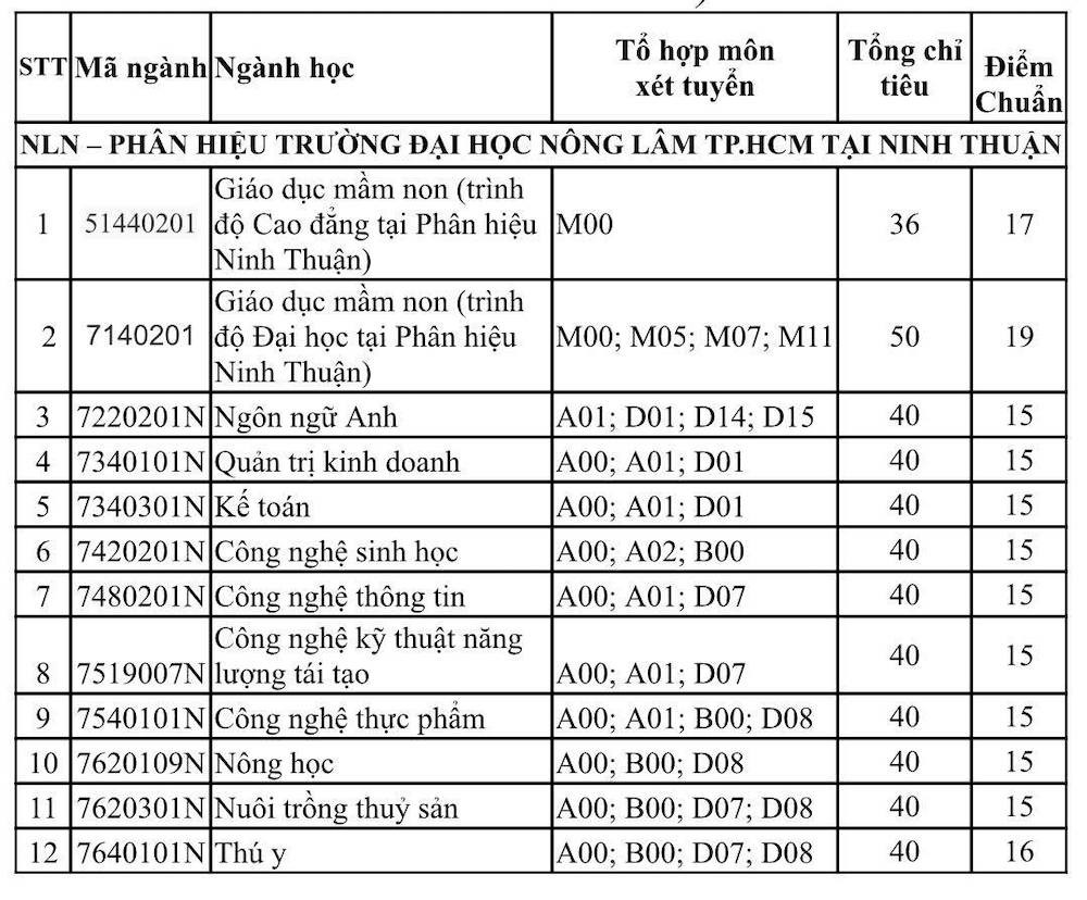 Tại Phân hiệu Gia Lai và Ninh Thuận, điểm sàn ĐH Nông Lâm TP.HCM là 15 điểm cho các ngành xét tuyển, ngoại trừ ngành Thú y điểm sàn xét tuyển là 16 điểm.