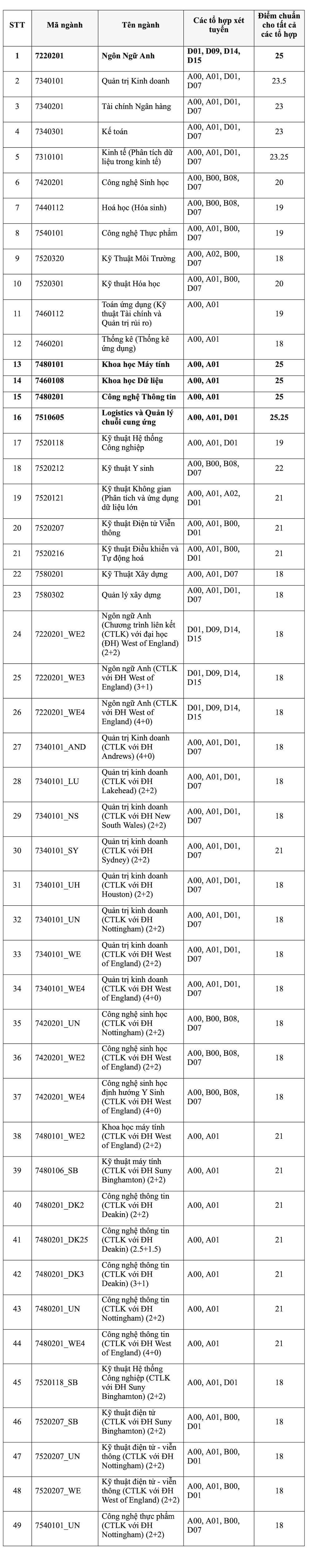 Theo đó, ngành Logistics và Quản lý chuỗi cung ứng có điểm chuẩn 25,25 cao nhất năm 2023. Các ngành Ngôn ngữ Anh, Khoa học Máy tính, Khoa học Dữ liệu và Công nghệ thông tin có điểm chuẩn 25. Cụ thể như sau: