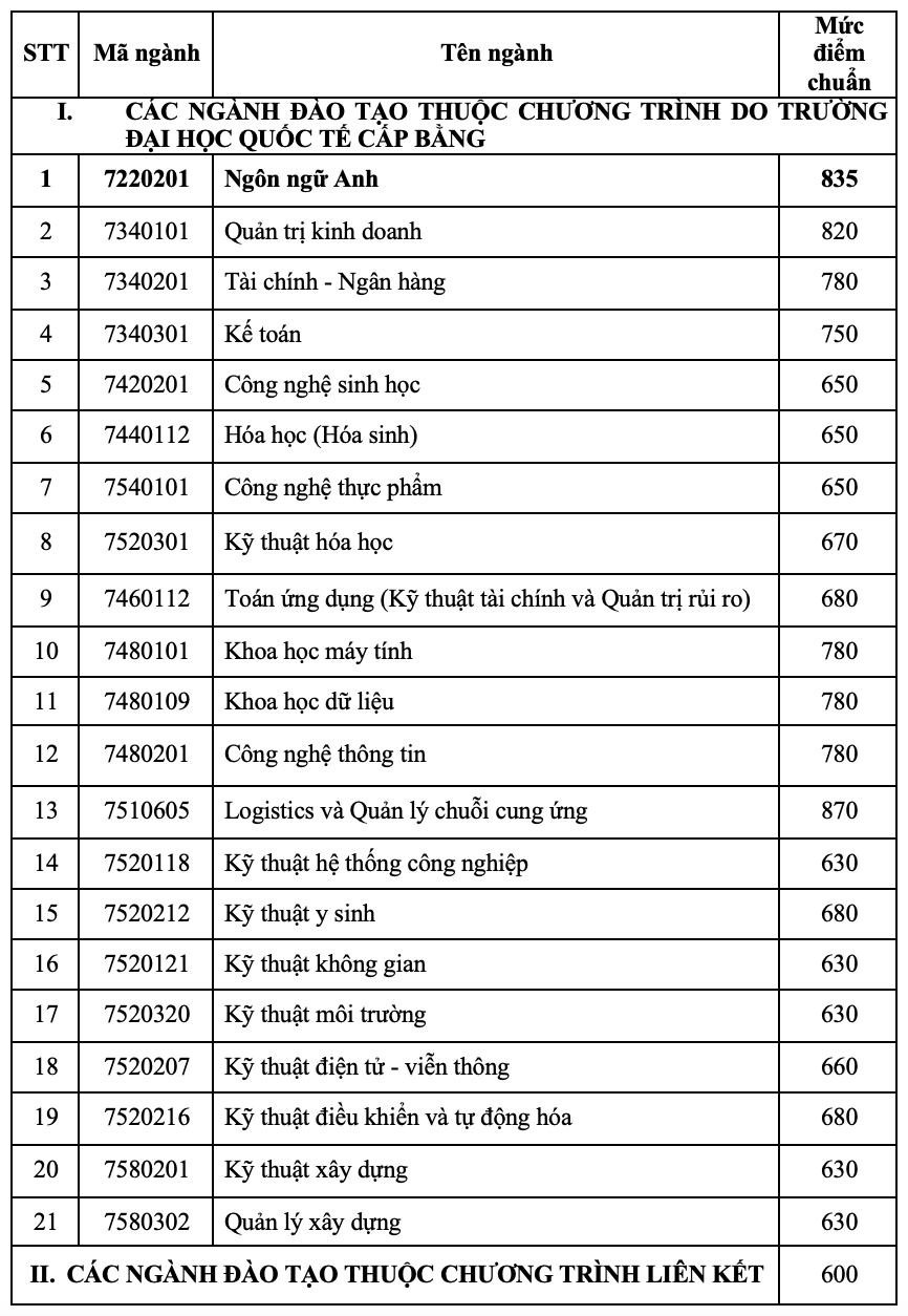 Với phương thức xét tuyển dựa trên kết quả kỳ thi Đánh giá năng lực do Đại học Quốc gia Thành phố Hồ Chí Minh tổ chức năm 2022), điểm chuẩn trúng tuyển vào các ngành đào tạo bậc đại học như sau: