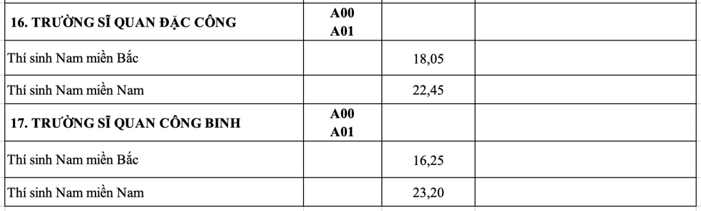 17 trường quân đội tuyển gần 4.400 chỉ tiêu, giảm 445 so với năm ngoái. Trường Sĩ quan Lục quân 1 là đơn vị tuyển sinh nhiều nhất với 494 chỉ tiêu, kế đến là Học viện Kỹ thuật Quân sự với 458 chỉ tiêu và Trường Sĩ quan Chính trị với 453 chỉ tiêu. Trường Sĩ quan Phòng hóa tuyển ít nhất 42 chỉ tiêu.