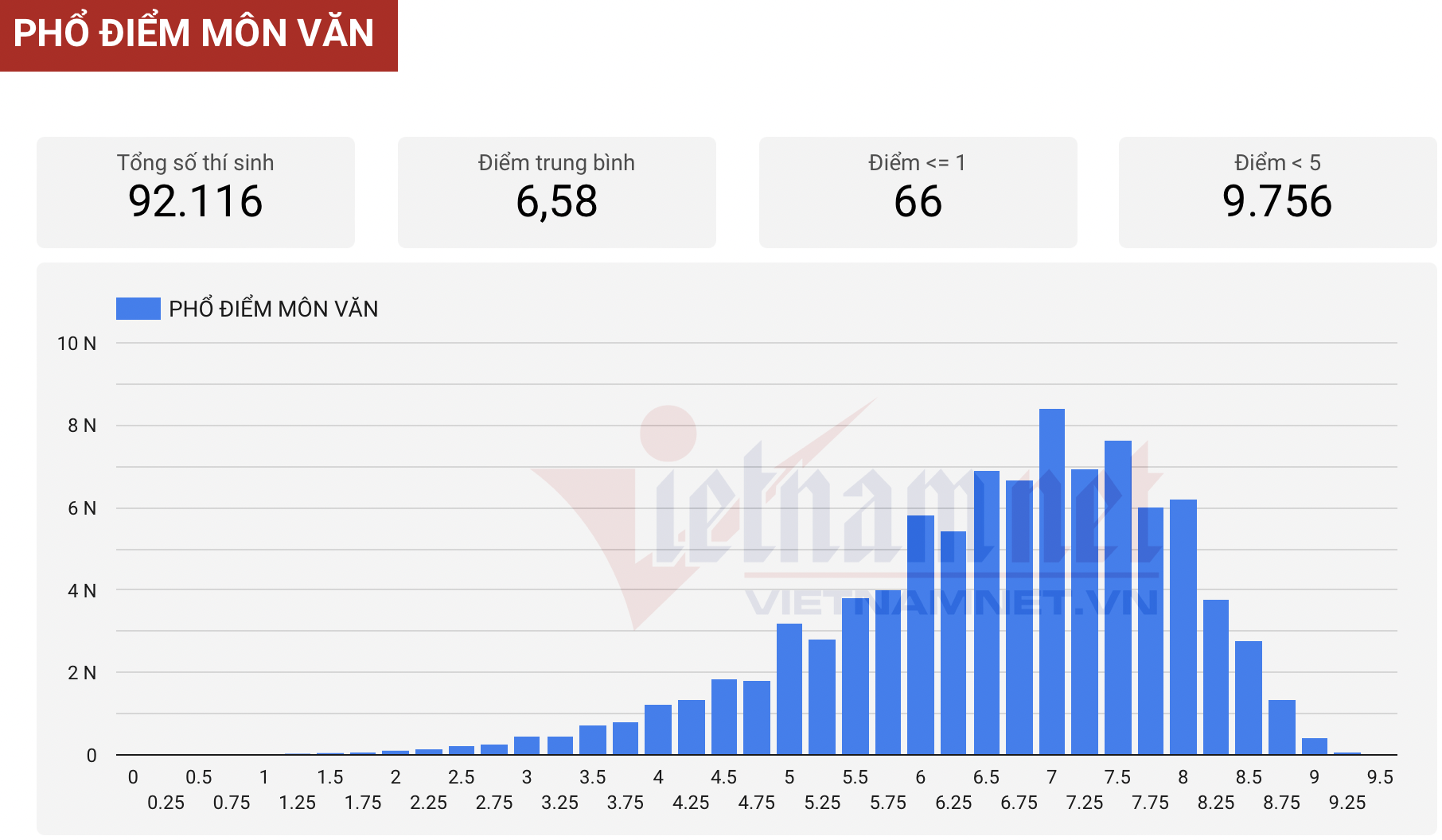 Môn Ngữ văn có 92.116 thí sinh dự thi; Điểm trung bình là 6,58; Có 9.756 thí sinh điểm dưới 5; Điểm cao nhất môn Ngữ văn là 9,5 và có 5 thí sinh đạt 9,5 điểm; Có 67 thí sinh đạt 9,25 điểm.