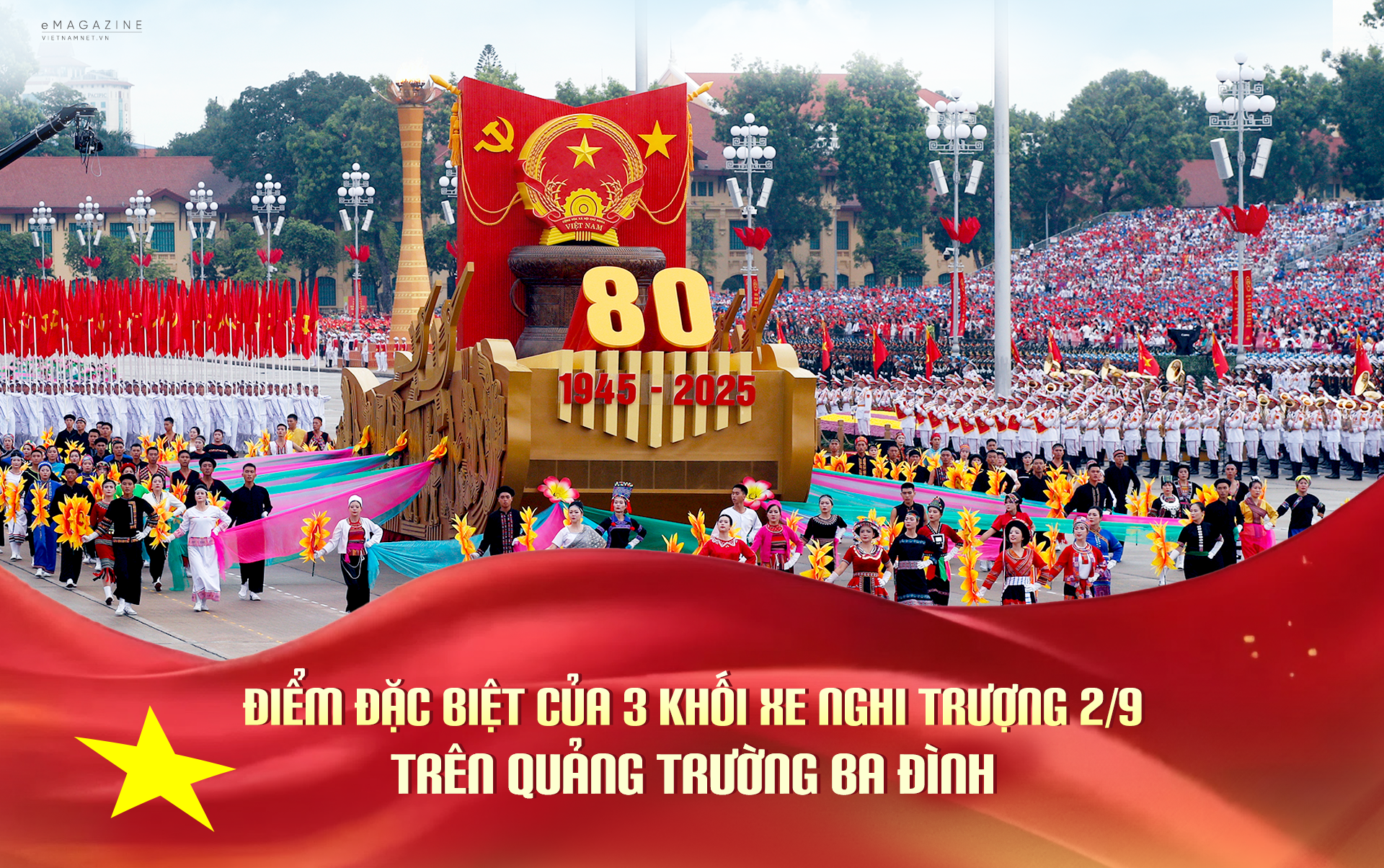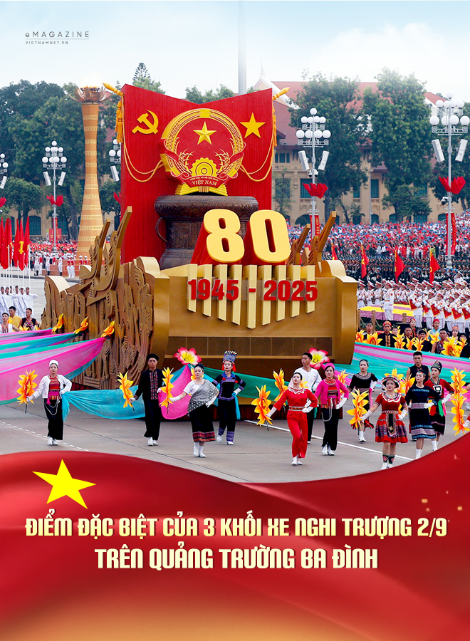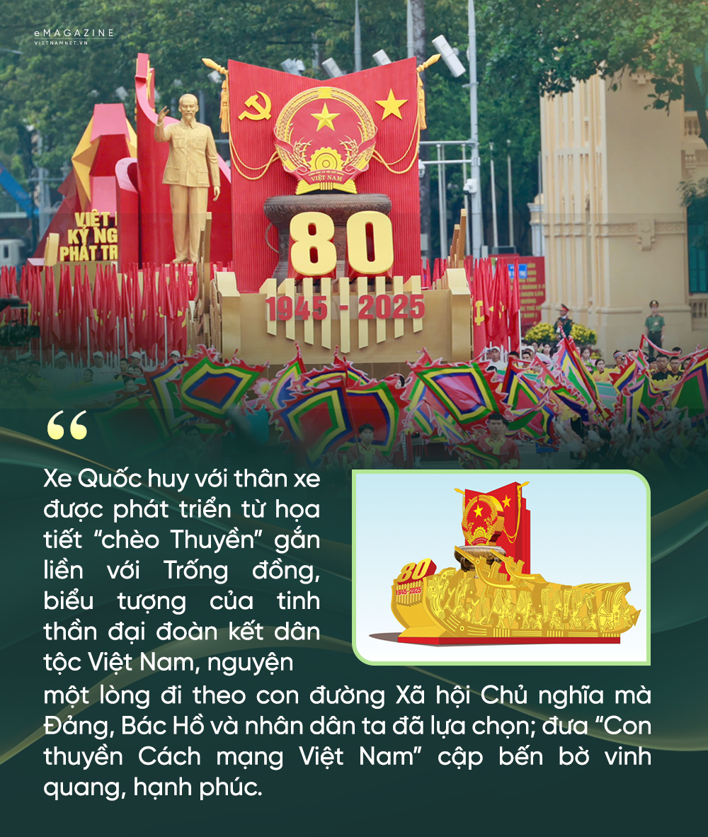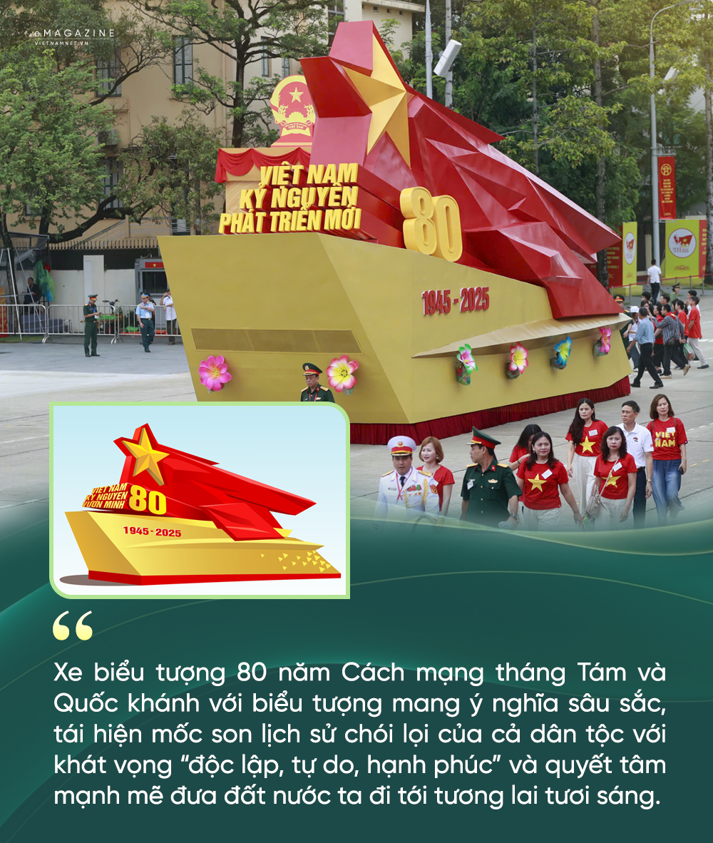 Xe rước biểu tượng 80 năm - đây chính là khối xe điểm nhấn trong lễ kỷ niệm, họa sĩ Nguyễn Tuấn Long cho biết xe biểu tượng dịp 80 năm Quốc khánh khác hoàn toàn so với dịp 70 năm Chiến thắng Điện Biên Phủ.