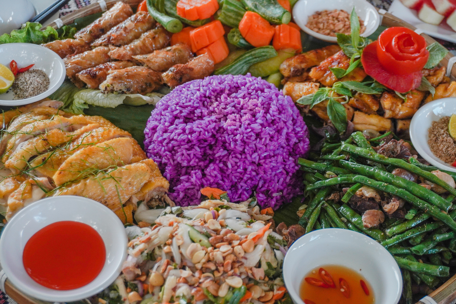 Trong đó, có nhiều món ăn, đặc sản địa phương khiến cô thích thú như: Mẹt gà với xôi tím, gà nướng, nộm, củ quả luộc chấm chẩm chéo…