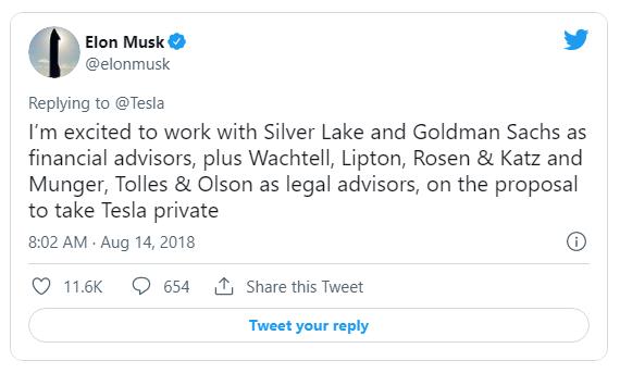 5. Giữa những đồn đoán điên cuồng về việc biến Tesla thành công ty tư nhân, Musk đã tweet rằng ông đã làm việc với Goldman Sachs Group Inc. và công ty Silver Lake Management LLC với tư cách là cố vấn tài chính. Tuy nhiên, điều đó không làm cho những người nghi ngờ im lặng và cổ phiếu tiếp tục lao dốc tới 15%.