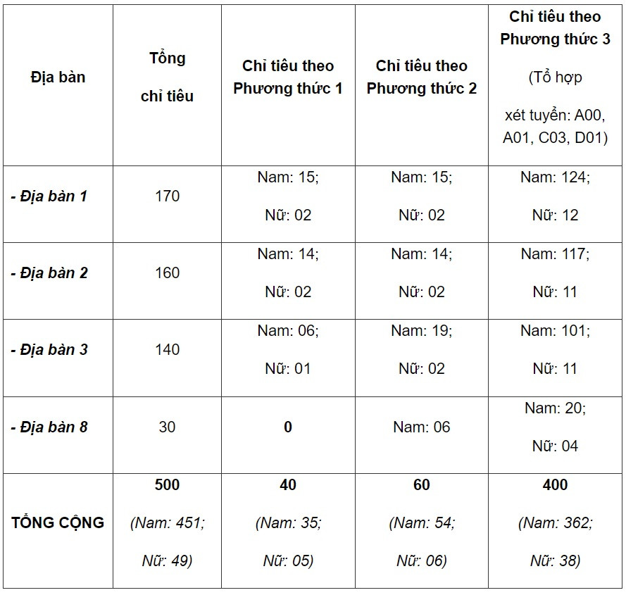 Theo phương án tuyển sinh do Học viện Cảnh sát nhân dân công bố, năm nay, trường sẽ tuyển 500 chỉ tiêu tuyển sinh đào tạo nhóm ngành nghiệp vụ Cảnh sát, trong đó tuyển 451 thí sinh nam; 49 thí sinh nữ. Cụ thể như sau: