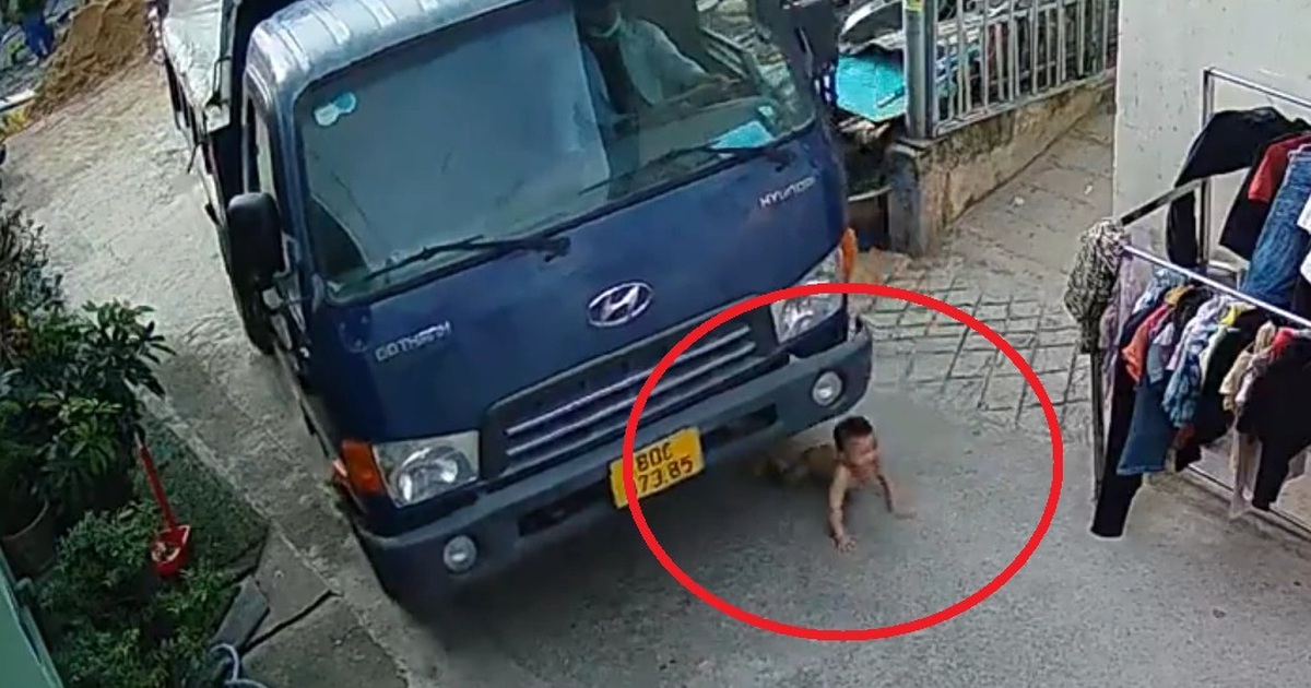 Bé 1 tuổi chạy chơi đúng điểm mù xe tải đang lùi