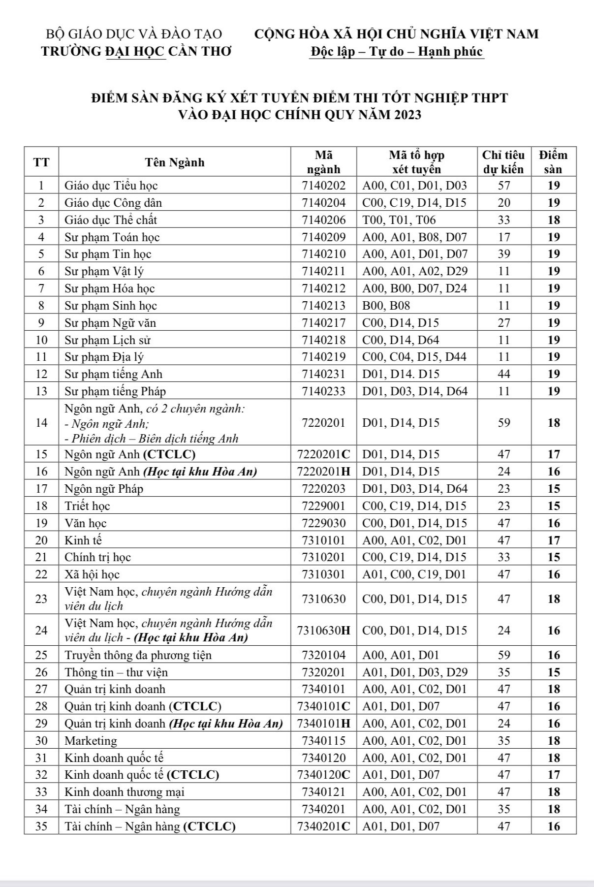 Dưới đây là bản chi tiết điểm sàn đăng ký xét tuyển điểm thi tốt nghiệp THPT vào Trường Đại học Cần Thơ năm 2023:
