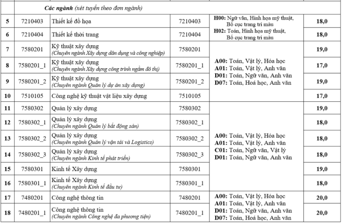 Theo đó, mức điểm nhận hồ sơ xét tuyển của các ngành/chuyên ngành của Trường ĐH Kiến trúc Hà Nội như sau: