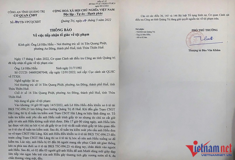 Thông tin với VietNamNet, người nhà tài xế Hiếu cho biết, anh Hiếu vừa có đơn Khiếu nại và yêu cầu xử lý về việc công an đánh người gây thương tích gửi lãnh đạo Bộ Công an, lãnh đạo Tỉnh ủy, UBND tỉnh và Công an tỉnh Quảng Trị.